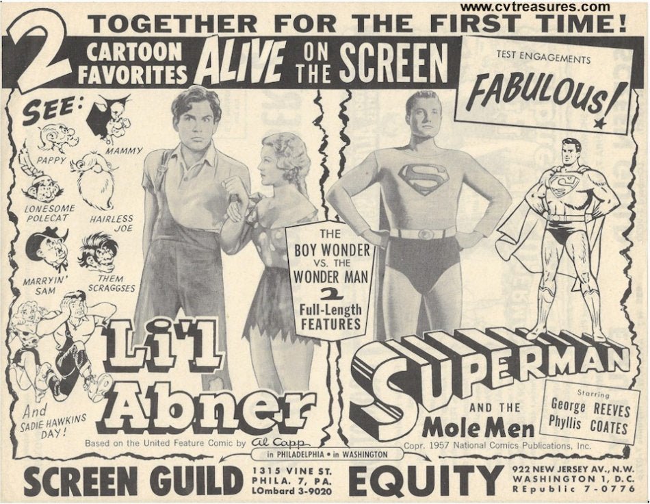 A vintage theater flyer and mailer used to promote the 1957 release of "Superman and the Mole Men" in a double feature with "Lil Abner" . Double sided. On the reverse has paid postage along with special promotion for Philadelphia and Washington DC theaters. Amazing near mint condition with just the right slight age toning for authenticity. No tears and wrinkles as most all of these you see for sale