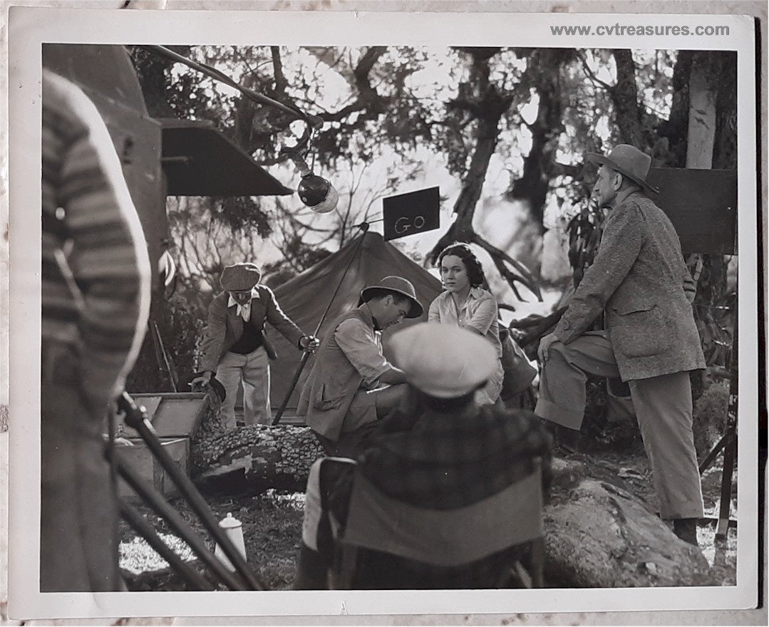 Beautiful vintage photo from "Tarzan", 1932 . Striking contrast with sepia tone showing Muareen Sullivan, co stars and Director getting ready for a scene. . Original studio snipe on back describes details of the photo.