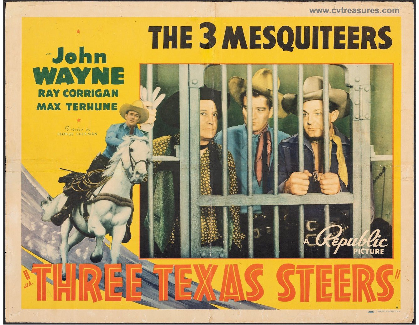 Prior to his breakout role in the 1939 classic Stagecoach, silver screen legend John Wayne starred in numerous B Westerns for the likes of Monogram and Republic Studios. Three Texas Steers is from the latter studio's series, based on William Cold MacDonald's Three Mesquiteers stories, where Wayne plays protagonist Stony Brook a total of eight times out of 58 films.