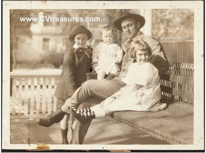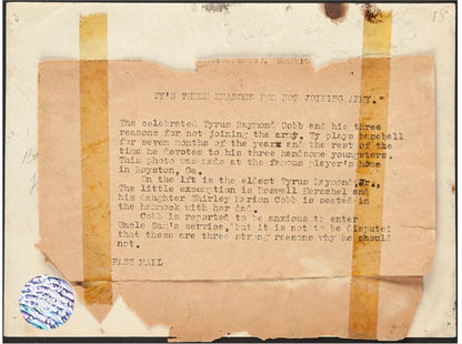 1918 Ty Cobb with His Children Original News Photograph. The Peach poses with his children Tyrus Raymond, Jr., Rosewell Herschel and Shirley Marion at his home in Royston, Georgia shortly before he began his military service. Paper caption with amazing provenance on verso. Measures 8x6".