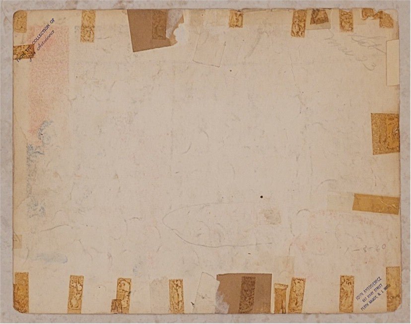 Condition: This #3 card (Frankenstein) has small paper losses at the corners and edges, a small bit of tape in the bottom border and a short strip of paper tape in the left border. The verso has a number of small pieces of tape around the borders and a number of tape stains as well, all of which can be corrected with restoration. However, we like the attractive vintage remnants of authenticity just as it is!