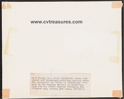 Starring the voices of Kathryn Beaumont, Ed Wynn, Richard Haydn, Sterling Holloway, Jerry Colonna, and Verna Felton. Directed by Clyde Geronimi, Wilfred Jackson, and Hamilton Luske. Unrestored photo with bright color and a clean overall appearances. They may have general signs of use, such as light edge and corner wear, soft creases, slight surface indentations. The verso of each photo has small strips of paper tape adhesive remnants. On the verso of two of the photos are studio captions detailing Disney's input (not this portrait photo). A Walt Disney production.