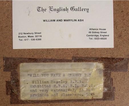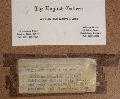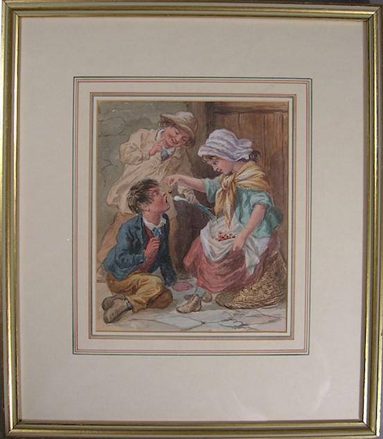 William Hemsley (British, 1819-1893) Attributed to William Hemsley (British, 1819-1893) Unsigned, but identified on a label on the reverse. Those familiar with his work or ability to research his work will conclude this is indeed his style and level of artwork. Watercolor on paper. Great subject matter with extraordinary detail. Sales History: Hemsley sold "The Weekly Newspaper" at Chrisites in 1996 for $28,980. Size: 8 1/4 x 6 3/4" unframed. 11x9" framed |