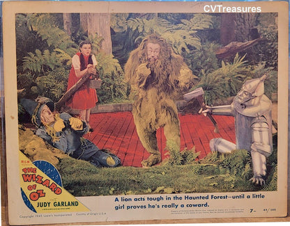 A great find, lobby cards from the 1949 reissue set are very highly prized by collectors of this all-time classic film. The majority of the cards feature scenes from the film that didn't appear in the original set of lobbies. Card #7 is one of those Rare Cards that captures a memorable moment, as the Cowardly Lion terrorizes Dorothy's other companions.