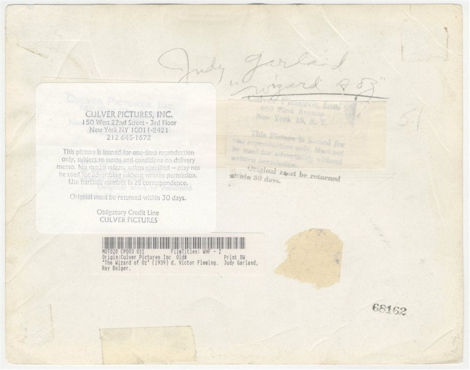 As a matter of fact, the Only place we have ever seen this photo is in Doug McClelland's book, "Down the Yellow Brick Road", so this may be the actual photo used in the book, which explains the editorial markings. Photo has some light creases. Also has several copyright labels on back